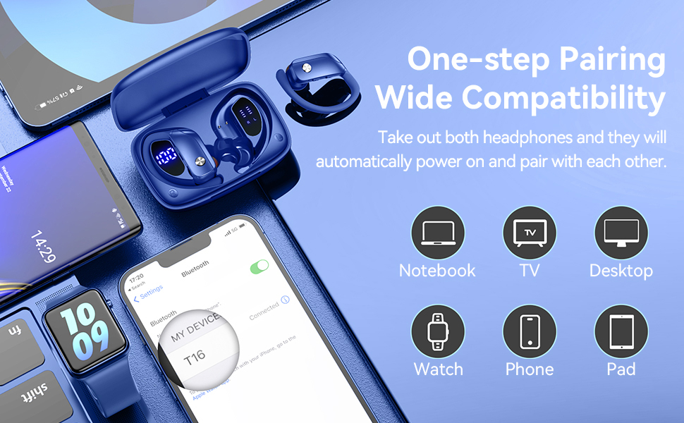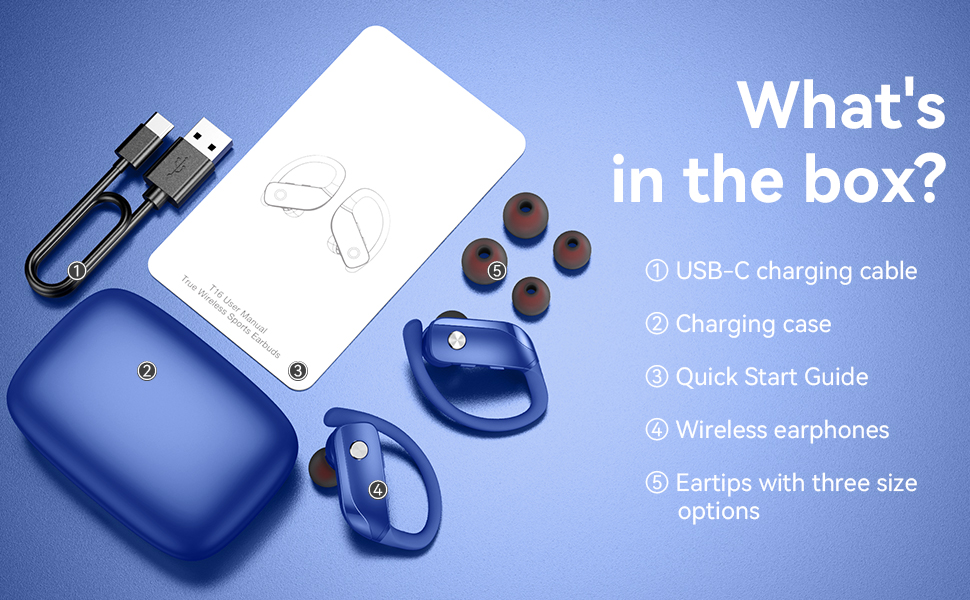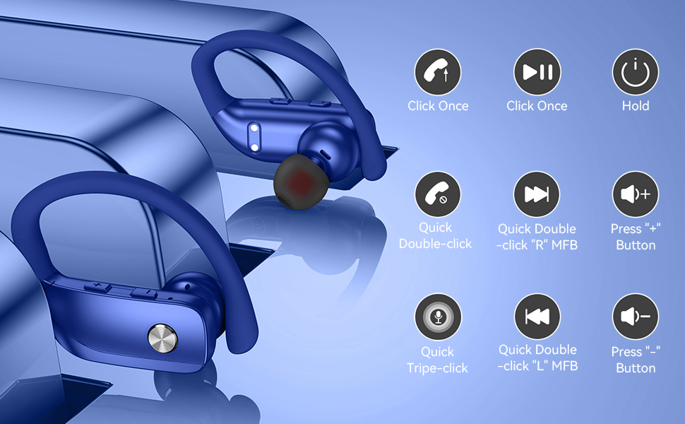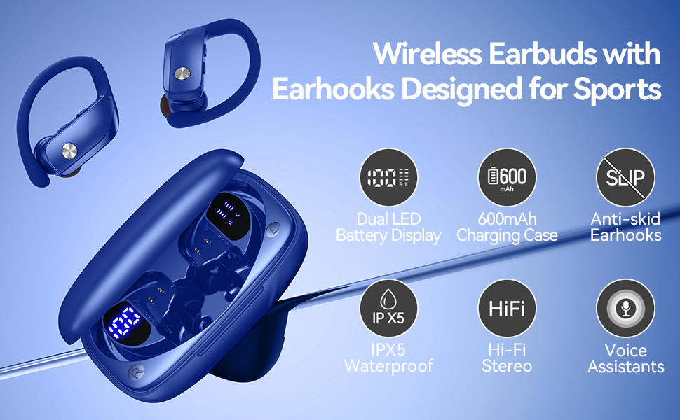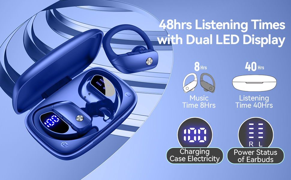 Wireless Earbuds Bluetooth Headphones 48hrs Play Back Sport Earphones with LED Display Over-Ear Buds with Earhooks Built-in Mic Headset for Workout Blue BMANI-VEAT00L